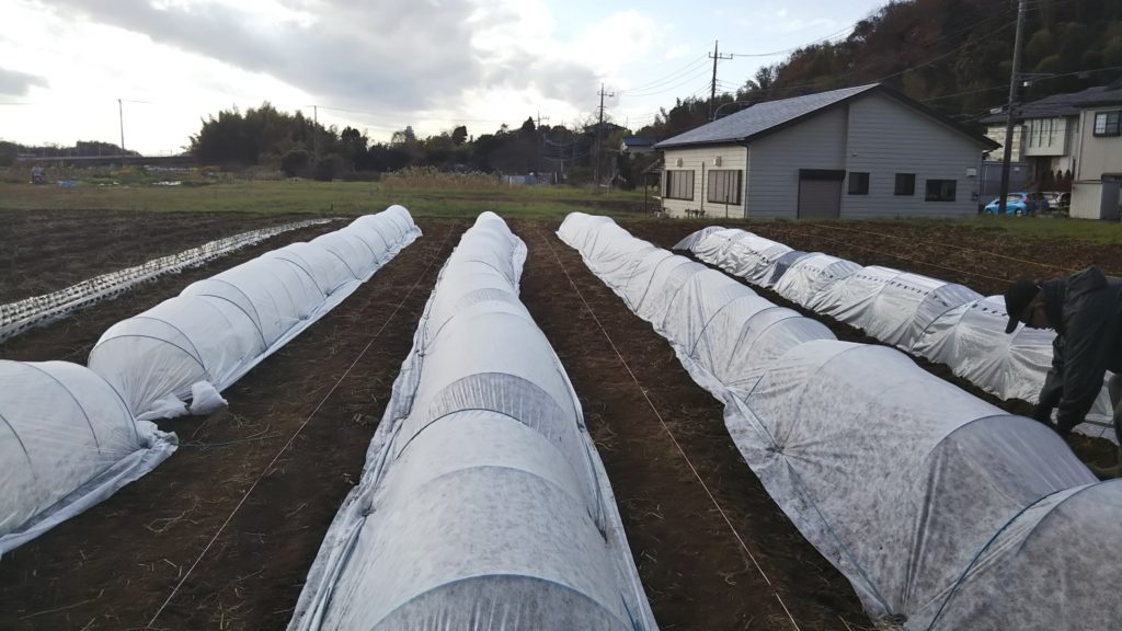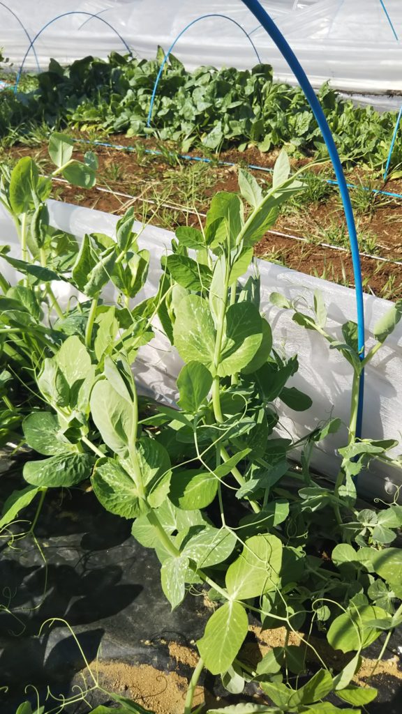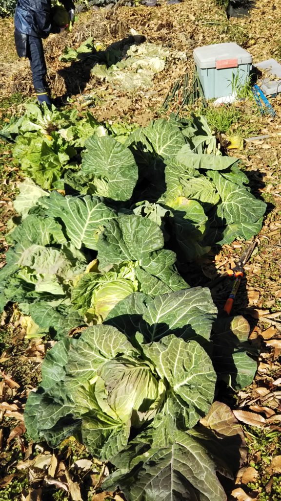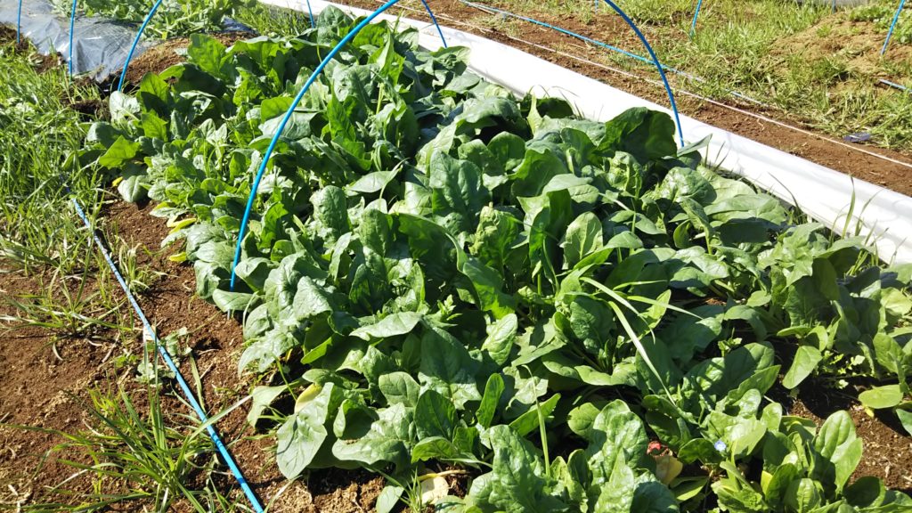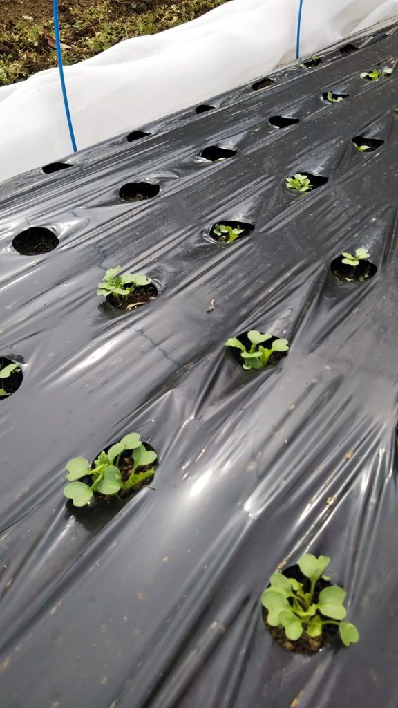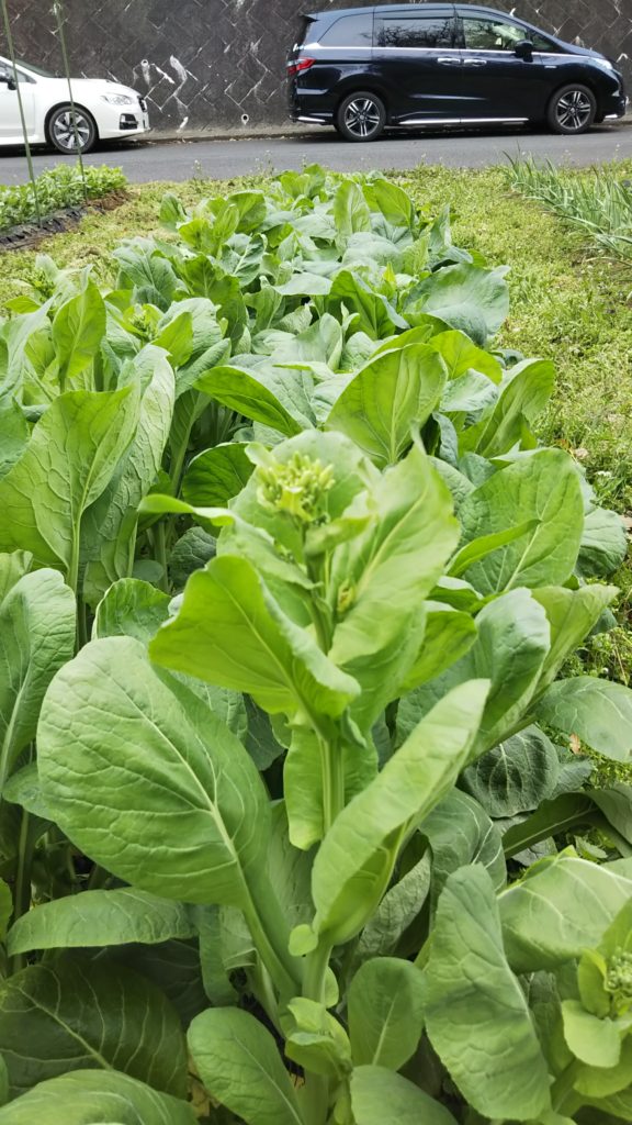 ■チンゲンサイ:このところの暖かさで急に育っていました。もともと播種時期を随分すぎて寒気にさらしたため、一気に董立ちしていました。一応董立ちした茎を収穫しましたが、まだ食べてません。播種適期を守ることは露地栽培の絶対条件だと実感しました。ここにはこの後小玉スイカを植えます。