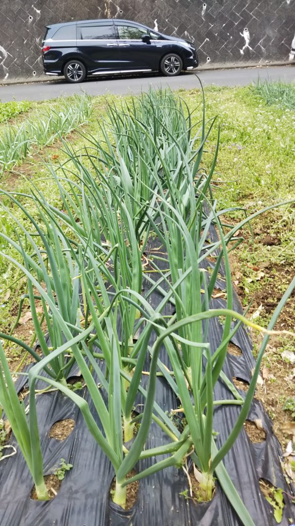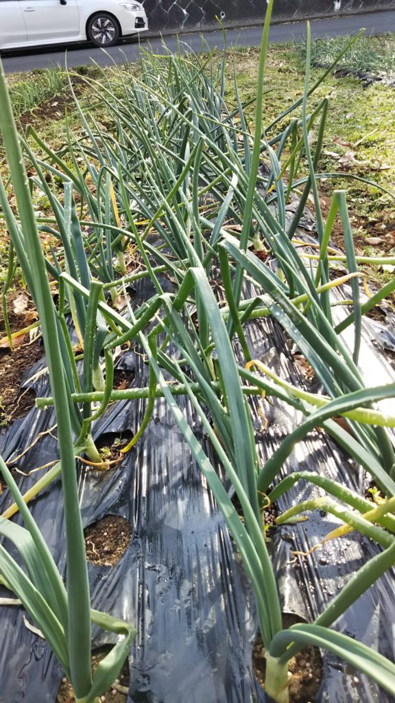 ■玉ねぎ:順調に育っているように見えます。追肥・除草・サンボルドー散布しました。隅っこにこっそり植えていた九条ネギも順調です。