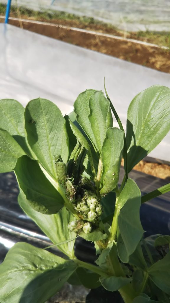 ■そら豆:トンネルを外し、支柱を立て、紐を回しました。アブラムシがびっしり。