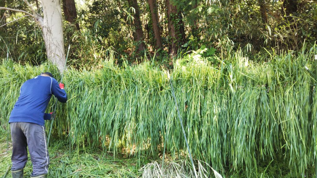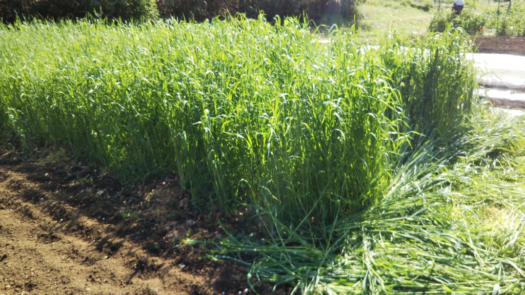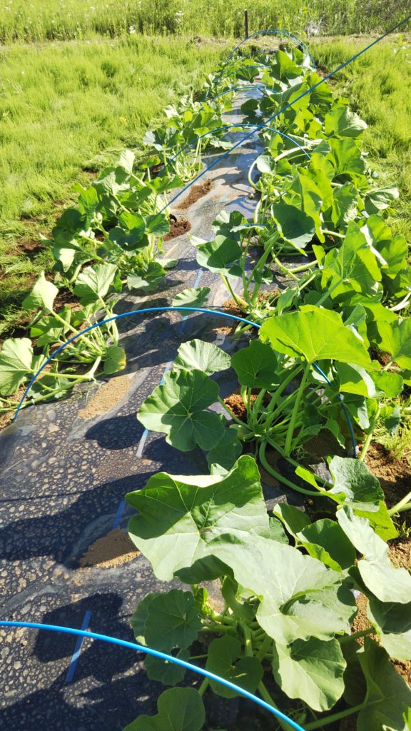 ■カボチャ:畝横にライムギの敷き藁施して誘引準備